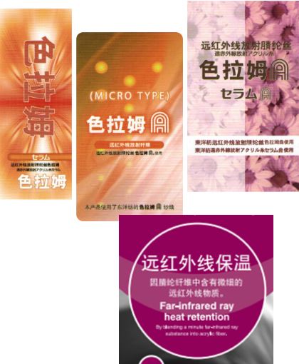 東洋紡公司作為保暖內衣材料銷售吸濕發熱性材料”依克絲”。但還有一種使用和“依克絲”完全不同的手法來開發的保暖內衣材料。這就是“色拉姆A”,“色拉姆A”是把具有遠紅外線放射性的陶瓷超微粒滲入到腈綸短纖維中的。由于這個陶瓷超微粒反射人體發出的遠紅外線,從而“色拉姆A”發揮對秋冬內衣不可缺少的優異的保暖效果。而且“色拉姆A”的保暖效果洗后幾乎沒有減少,其顯色性、染色牢度也與普通腈綸短纖維相同。